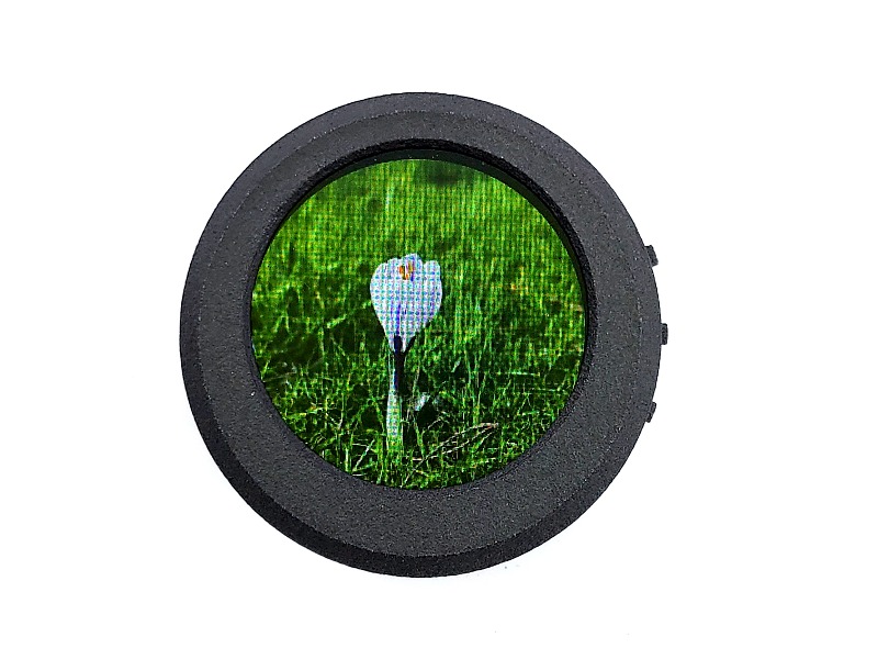 Die digitale Brosche Pixel Pin. Schmuckstück mit einem LCD-Bildschilrm. Erlaubt das Anzeigen von eigenen Bildern. Verschiedene zufallsbasierte Visuals.
